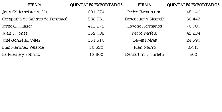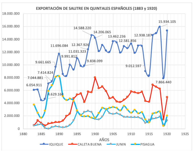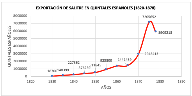 «En 1870 se exportaron 2,500,000 quintales para todos los mercados extranjeros. En 1871 esta cifra se aumentó a 3,600,000 quintales, i en 1872 se remontó a la enorme cantidad de 4,420,000. Estos guarismos suministrados oficialmente por el Prefecto de la Provincia de Tarapacá, única que produce salitre, prueban la rapidez con que aumenta el tráfico de este ramo de la producción» (La Estrella de Panamá, 10 de febrero de 1873:1).
