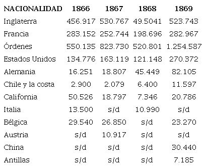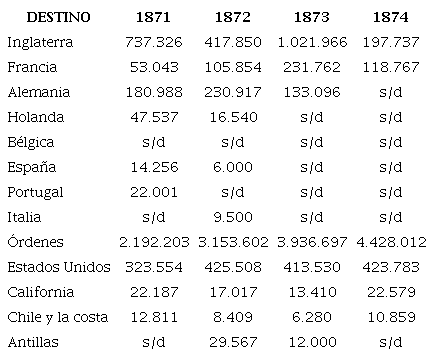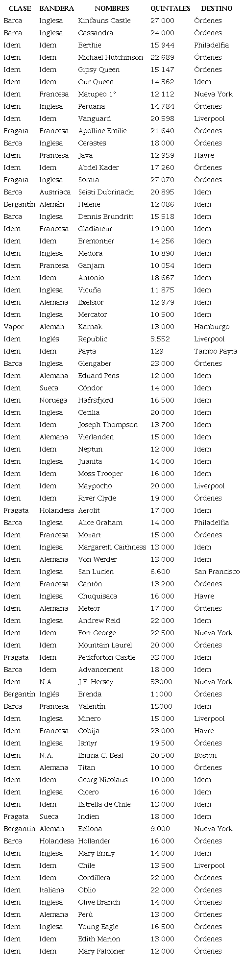 Para comprender mejor el proceso de mundialización de este producto cuando iniciaba su consolidación, veamos un mes del año 1873 con detalles de embarcaciones, cantidades y destino (Tabla 5).