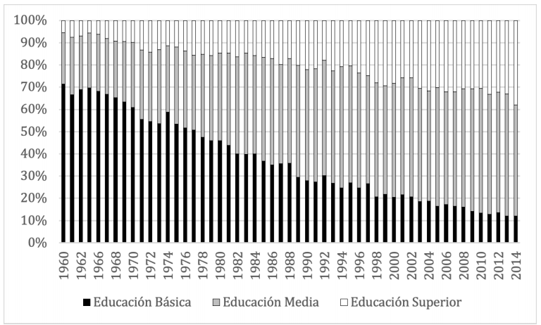 Esta «nueva» base industrial demandó un «nuevo» tipo de obrero, i.e., uno apto para atender procesos laborales que, por un lado, son más complejos y, por otro, aunque se trate de procesos simples, tienen a la lectoescritura como condición de ejecución (Iñigo, 2021). Así, las transformaciones industriales demandan el aumento de años de escolaridad promedio (que pasó de 9,1% en 1992 a 11,7% en el 2020); la continua caída de la tasa de personas mayores de 18 años sin educación formal (que pasó de 4,6% en 1992 a 2,4% el 2020); el aumento de tasa de personas mayores de 18 con educación media completa (que pasó de 23,8% en 1992 a 29,2% el 2020) y el aumento de personas mayores de 18 con educación superior completa (que pasó del 7,8% en 1992 a un 24 % en el 2020) (Ministerio de Desarrollo Social, 2024). Otra fuente que confirma este cambio en los atributos de la fuerza de trabajo es la OCDE (2024).