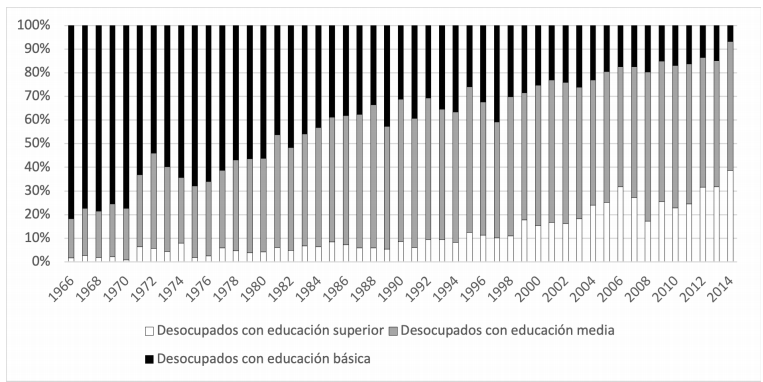 La sobreproducción de obreros calificados también se hizo sentir. Como destaca Marx, la valorización exige un «exceso» de fuerza de trabajo (Marx, 1998). Así, el aumento de la ocupación del obrero calificado fue acompañado por su también creciente participación en la desocupación total. Sobre todo, desde los 2000 en adelante, aunque la tendencia puede ya apreciarse previamente, según se muestra en el siguiente gráfico: