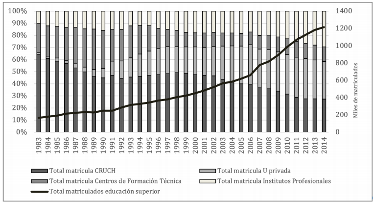 En el contexto recesivo de la década de los ochenta, el capital chileno impulsó la formación de su mano de obra calificada por medio de la «liberación» de la educación superior. Así, de ser provista directamente y casi en su totalidad por su representante político (i.e., el Estado) pasó a encontrarse a merced, de manera significativa, del apetito de sus fragmentos particulares (i.e., el «mercado»), tal y como muestra el siguiente gráfico: