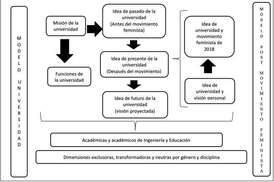 Se identificó una idea de universidad de pasado, una de presente y una de futuro, todas ellas diferenciadas a partir del mayo feminista estudiantil (Chile, 2018) y de la visión personal de las y los participantes. En ese contexto, ambas facultades expresan en sus discursos una vinculación con el movimiento feminista en todos los imaginarios de universidad, la que puede ser exclusora o transformadora y tiene como referencia el acervo personal. La movilización feminista de 2018 es interpretada por el cuerpo académico como un referente para la definición de la idea de universidad, lo que no necesariamente se traduciría en un cambio concreto.