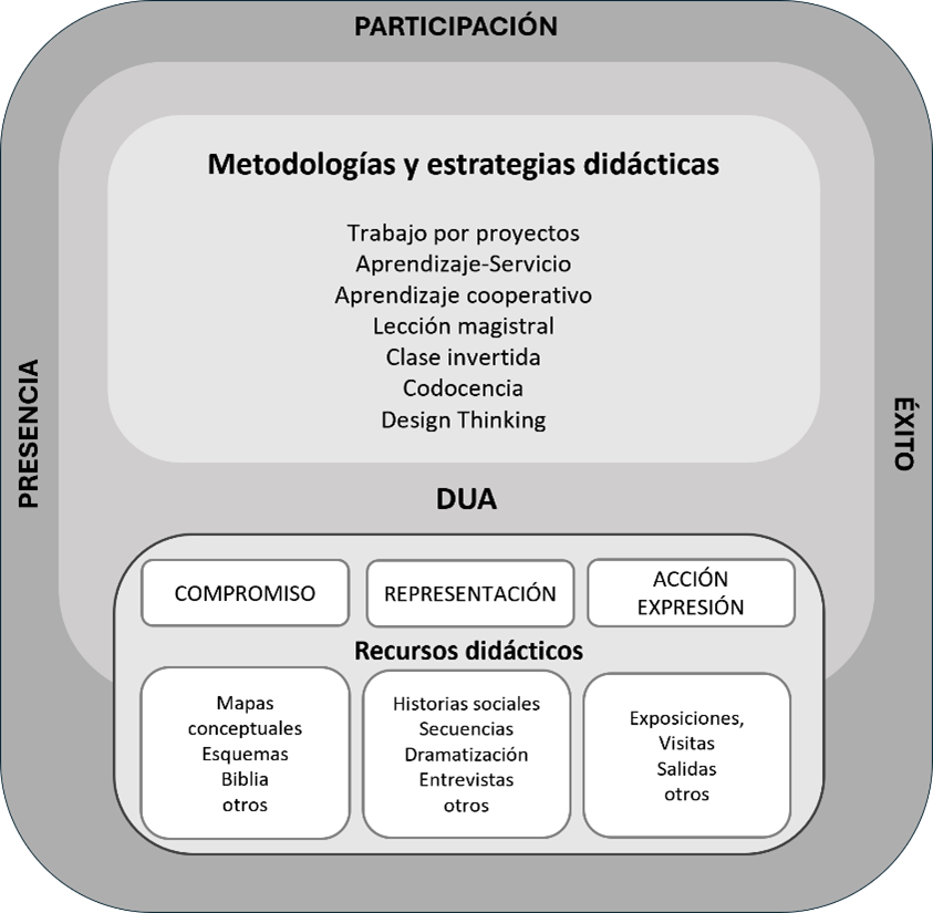 El gran aporte de esta propuesta que debatimos a nivel metodológico estriba en la aplicación de los principios del Diseño Universal de Aprendizaje (DUA), promoviendo las diferentes formas de compromiso, representación, acción y expresión (CAST, 2018). De esta manera, a través de diferentes estrategias y recursos didácticos, se facilita la atención a las diferencias en el aula y se favorecen los principios básicos de la inclusión: presencia, participación y éxito (Booth y Ainscow, 2015) (Figura 2). El enfoque global, el desarrollo integral y la interdisciplinariedad precisan, en la enseñanza de la religión y de todas las materias, un ajuste a las características del alumnado (Escorcia, 2021).