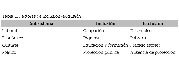 Cada sociedad y cada época definen su dentroy su fuera. En el amplio marco del contexto de la sociedad española de las primeras décadas del siglo XXI, extrapolable a diferentes escenarios geopolíticos, los cuatro principales factores de inclusión-exclusión serían los que se muestran en la Tabla 1: