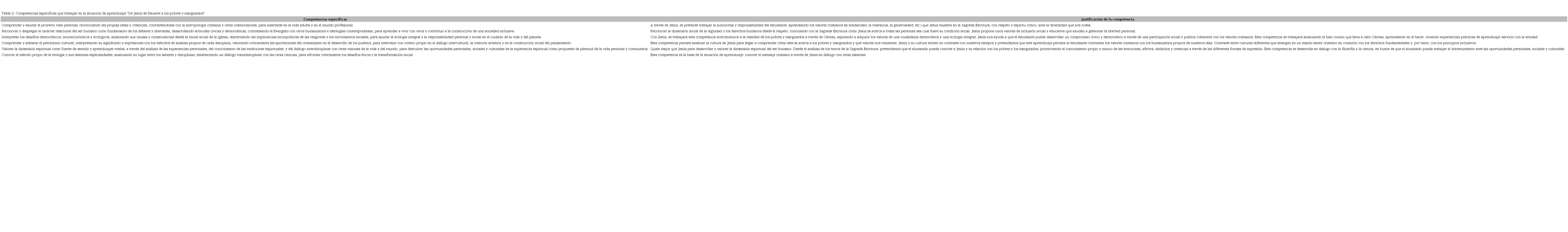 En contextos en los que una población se encuentra en riesgo de exclusión social, se hace más necesario trabajar la pobreza y la marginación desde un posicionamiento inclusivo que favorezca el desarrollo de las potencialidades de las personas. La UNESCO (2017, p. 7) define inclusión “como el fortalecimiento de la capacidad del sistema educativo para llegar a todos los estudiantes”. Sin embargo, la inclusión educativa va más allá de una serie de principios que se desarrollan en las escuelas; es una forma de entender la educación e incluso la vida mediante la defensa del derecho a una educación de calidad que dé respuesta a sus necesidades individuales, sin olvidar la importancia de un aprendizaje global desarrollado en un grupo social. Las necesidades del alumnado de Bachillerato han variado en los últimos años, especialmente tras la pandemia de Covid-19, tal y como se defiende en la Nueva Agenda de Juventudes y la Cumbre del Futuro; hoy emergen nuevos desafíos relevantes como el tratamiento de la información, la difusión de la inteligencia artificial, la apuesta por una economía inclusiva y la promoción de la paz (Del Valle y Von Feigenblatt, 2024). Por ello, el alumnado de Bachillerato es un destinatario clave para la construcción de una sociedad más justa y equitativa. De esta forma, partiendo de una pregunta clave y del fundamento teórico de la Sagrada Escritura, se propone una planificación didáctica que desarrolle la siguiente situación de aprendizaje: “De Jesús de Nazaret a los pobres y marginados”. Esta se justifica en la necesidad de conseguir en el alumnado de 2º de Bachillerato diferentes metas relacionadas con la adquisición de valores universales y competencias para desenvolverse en la sociedad (ver Tabla 2)y en el currículum establecido por la Resolución de 21 de junio de 2022.