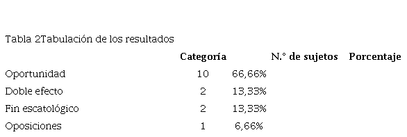 Las categorías que se crearon a partir de las respuestas fueron las siguientes: Oportunidad: potencia a la religión; Doble efecto: potencia, pero a la vez la amenaza; fin escatológico: el fin de las religiones.