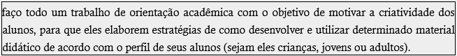 faço todo um trabalho de orientação acadêmica com o objetivo de motivar a criatividade dos alunos, para que eles elaborem estratégias de como desenvolver e utilizar determinado material didático de acordo com o perfil de seus alunos (sejam eles crianças, jovens ou adultos).