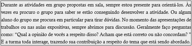 Durante as atividades em grupo propostas em sala, sempre estou presente para orientá-los. Às vezes eu procuro o grupo para saber se estão conseguindo desenvolver a atividade. Ou algum aluno do grupo me procura em particular para tirar dúvidas. No momento das apresentações de trabalhos ou nas aulas expositivas, sempre abrimos para discussão. Geralmente faço perguntas como: “Qual a opinião de vocês a respeito disso? Acham que está correto ou não concordam? ” E a turma toda interage, trazendo sua contribuição a respeito do tema que está sendo abordado.