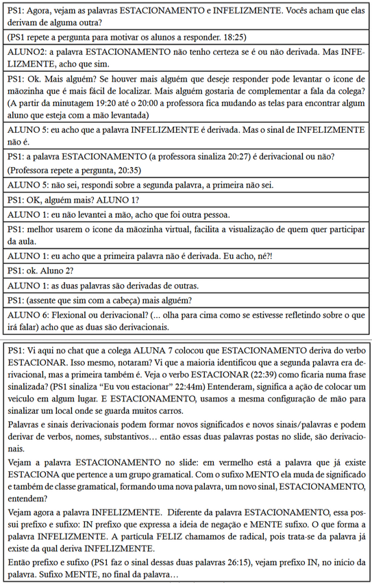 Fonte: dados da pesquisaA partir dessa indagação “Vocês acham que elas derivam de alguma outra?” realizada pela professora, compreendemos a inclusão da opinião dos alunos, não centralizando falas e teorias em si, mas implicitamente remetendo ao conhecimento que eles já possuem da língua como necessário e importante. Considera-se, portanto, por essa abordagem, a independência e a equipolência de vozes dos alunos, que respondem e corroboram as aulas tanto de PS1 quanto de PS2. Os alunos e professores não se sujeitam ao acabamento, pelo contrário, eles se transformam e se performam, tornando-se únicos, responsivos e inacabados. A prática docente de cada um é diferenciada pelos métodos utilizados, pelos materiais disponibilizados e pelas relações que estabelecem com o alunado, sendo, sobretudo, práticas polifônicas, que não permitem centralizar o conhecimento, tampouco estagná-lo apenas em si, mas reverberam Outras vozes, as vozes dos alunos, de Outros docentes, de Outras práticas assertivas, da Universidade em si. Essas vozes em equipolência formam e performam professores Surdos, potentes na arte de ensinar.