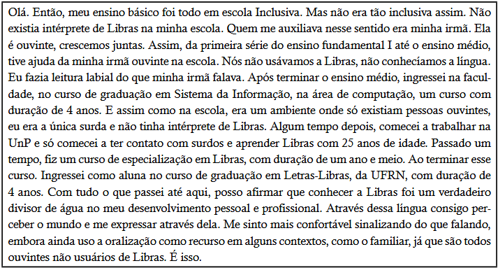 Olá. Então, meu ensino básico foi todo em escola Inclusiva. Mas não era tão inclusiva assim. Não existia intérprete de Libras na minha escola. Quem me auxiliava nesse sentido era minha irmã. Ela é ouvinte, crescemos juntas. Assim, da primeira série do ensino fundamental I até o ensino médio, tive ajuda da minha irmã ouvinte na escola. Nós não usávamos a Libras, não conhecíamos a língua. Eu fazia leitura labial do que minha irmã falava. Após terminar o ensino médio, ingressei na faculdade, no curso de graduação em Sistema da Informação, na área de computação, um curso com duração de 4 anos. E assim como na escola, era um ambiente onde só existiam pessoas ouvintes, eu era a única surda e não tinha intérprete de Libras. Algum tempo depois, comecei a trabalhar na UnP e só comecei a ter contato com surdos e aprender Libras com 25 anos de idade. Passado um tempo, fiz um curso de especialização em Libras, com duração de um ano e meio. Ao terminar esse curso. Ingressei como aluna no curso de graduação em Letras-Libras, da UFRN, com duração de 4 anos. Com tudo o que passei até aqui, posso afirmar que conhecer a Libras foi um verdadeiro divisor de água no meu desenvolvimento pessoal e profissional. Através dessa língua consigo perceber o mundo e me expressar através dela. Me sinto mais confortável sinalizando do que falando, embora ainda uso a oralização como recurso em alguns contextos, como o familiar, já que são todos ouvintes não usuários de Libras. É isso.