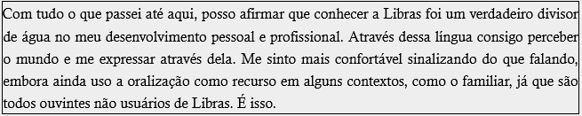 Com tudo o que passei até aqui, posso afirmar que conhecer a Libras foi um verdadeiro divisor de água no meu desenvolvimento pessoal e profissional. Através dessa língua consigo perceber o mundo e me expressar através dela. Me sinto mais confortável sinalizando do que falando, embora ainda uso a oralização como recurso em alguns contextos, como o familiar, já que são todos ouvintes não usuários de Libras. É isso.