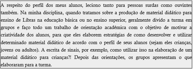 A respeito do perfil dos meus alunos, leciono tanto para pessoas surdas como ouvintes também. Na minha disciplina, quando tratamos sobre a produção de material didático para ensino de Libras na educação básica ou no ensino superior, geralmente divido a turma em grupos e faço todo um trabalho de orientação acadêmica com o objetivo de motivar a criatividade dos alunos, para que eles elaborem estratégias de como desenvolver e utilizar determinado material didático de acordo com o perfil de seus alunos (sejam eles crianças, jovens ou adultos). A escrita de sinais, por exemplo, como utilizar isso na elaboração de um material didático para crianças?! Depois das orientações, os grupos apresentam o que elaboraram para a turma.