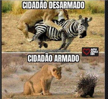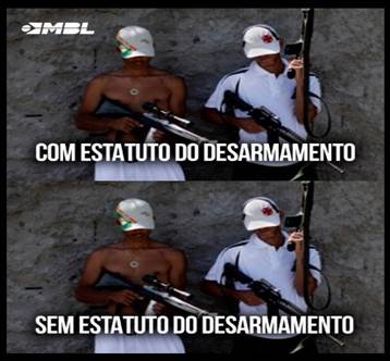 Nesse meme, as valorações sobre as políticas desarmamentistas foram trabalhadas a partir de uma fotomontagem com duas divisões retratando as seguintes situações: “com Estatuto do Desarmamento” e “sem Estatuto do Desarmamento”. Em ambos os contextos, encontram-se dois sujeitos de pele preta portando armas de fogo. A construção de sentidos operacionalizada nesse meme se relaciona com os discursos políticos sobre o armamento e direciona para uma narrativa de naturalização de estereótipos raciais, ao “fixar” estereotipagens do sujeito (que independente do Estatuto do Desarmamento para portar armas de fogo) como marginalizado, periférico, “fora da lei”, como visto anteriormente, e agora racializado.