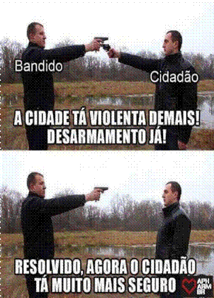 O meme acima é composto por uma fotomontagem com figuras masculinas representando posições-sujeito de “bandido” e de “cidadão”, dividida em dois recortes com as seguintes enunciações: “A cidade está violenta demais! Desarmamento já!” e “Resolvido, agora o cidadão tá muito mais seguro”. No primeiro enunciado, ambos os sujeitos estão portando armas de fogo, enquanto no segundo, apenas o sujeito “bandido”. A construção de sentido direciona o olhar para uma tentativa de descredibilização das políticas desarmamentistas, pois fica subentendido que essa prática possa ser benéfica apenas ao sujeito “bandido”, de acordo com o meme.