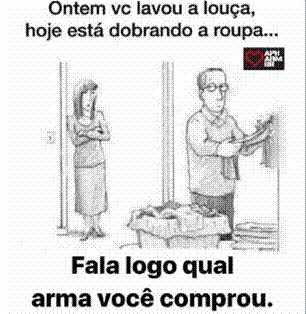 A partir da construção composicional, outro sentido gestado é de reforço dos papéis sociais de gênero, pois subentende-se que é o sujeito-mulher quem realiza habitualmente os afazeres do lar, fato expresso pela enunciação-confrontação “fala logo qual arma você comprou”. Outra possibilidade de interpretação sugere que a aquisição de armas é prática recorrente nesse contexto familiar.