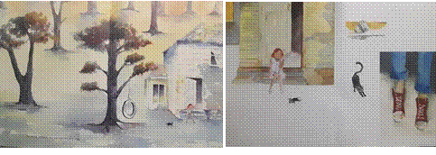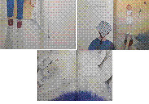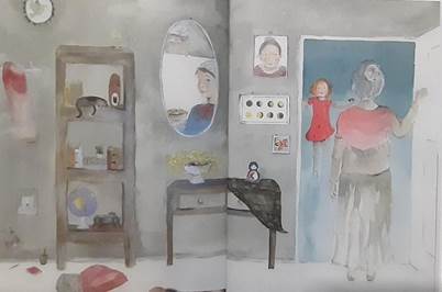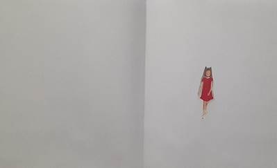 Na segunda folha dupla, a ilustradora utiliza da técnica do quadrinho para mostrar partes da situação: uma menina inconformada com o espaço em que se encontra; uma possível adulta vestindo jeans e um par de sapatos vermelhos; além do destaque ao livro que se encontra ao lado da menina e em evidência na parte superior da folha dupla. A porta aberta da casa não é convidativa, o espaço em branco, do lado de fora, parece fazer um convite a ser preenchido.