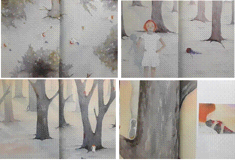 As seis ilustrações na Figura 7 nos mostram algumas enunciações que remetem à versão clássica: na primeira, temos dois espaços: a casa em um espaço menor; e a floresta sobressaindo em tamanho comparada a casa. Dois mundos presentes na vida da menina de cabelos vermelhos. A imagem da menina parece nos transmitir uma angústia, comprovada com o texto verbal: “Às vezes, minha casa parece tão pequena”. O espaço da floresta na página dupla é bem maior que o espaço ocupado pela casa. Já há um enunciado para o leitor atento sobre essa diferença, essa discrepância entre os lugares, sugerindo um discurso de que a floresta é maior, que poderia preencher as expectativas da menina, pois ela considera a casa pequena.