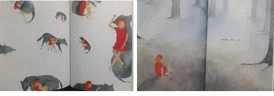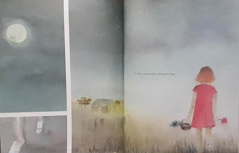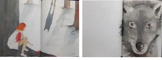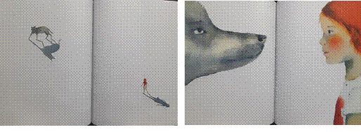 O encontro do possível lobo, numa primeira leitura, com a menina, se concretiza, mas não ocorre como sucedeu-se na narrativa clássica. Há um reconhecimento entre eles. Há um encontro que demonstra um se ver no outro, se identificar. A cor vermelha, o elemento narrativo, o enunciado, que traz ecos de sentidos para a narrativa, vai ocupando o vestido da menina, de branco está passando para a cor vermelha. O enunciado da menina que ia buscar flores para sua avó se encontra com o enunciado sobre o lobo. Mas esse lobo tem algo diferente, não se apresenta como aquela figura clássica, um devorador de meninas desobedientes. Nesse lobo há um semblante acolhedor, uma imagem que nos leva a acreditar que não seja um lobo, mas uma loba, uma personagem que acolhe a menina, que mostra um outro lado da história, a do abrigo, de um porto seguro, de algo para ser compartilhado e experenciado. Visualizamos agora a menina e a loba se conhecendo e se reconhecendo como figuras femininas.