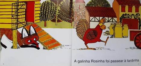 A narrativa infantojuvenil O passeio de Rosinha, de Pat Hutchins, tradução de Gian Calvi, publicada pela Editora Global em 2004, conta uma história de uma galinha que decide fazer um passeio, mas não percebe em momento algum, a companhia silenciosa de uma raposa que tenta, de todas as formas, agarrá-la. Seria uma narrativa simples, se as duas linguagens, verbal e visual, dissessem a mesma coisa. O ponto de atenção ao leitor nessa narrativa é o discurso presente na linguagem visual ser diferente da linguagem verbal. Temos dois discursos diferentes que só são vistos pelo leitor, pela ação da leitura. A narrativa ganha vida quando o leitor observa as duas linguagens e percebe que os discursos são diferentes.