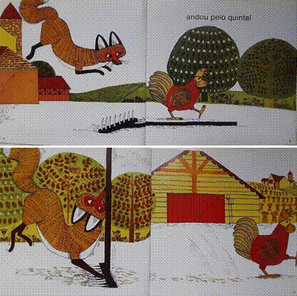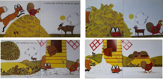 Nessa montagem de folhas duplas, temos três discursos sendo visualizados pelo leitor: o discurso de Rosinha realizando seu passeio, o da Raposa tentando capturar a Rosinha e das personagens bode, dois ratinhos e um esquilo que estão acompanhando as peripécias da raposa em tentar agarrar sua possível presa. A primeira personagem que acompanha a narrativa nessas duas folhas duplas é um bode que, de longe, percebe todas as tentativas da raposa em conseguir pegar Rosinha. O olhar do bode na primeira folha dupla é a de frente com a ação. Ele visualiza Rosinha no monte de capim e, logo depois, a raposa na tentativa de um pulo e pegar a presa de surpresa. E ainda há dois ratinhos que estão no capim acompanhando a frustrada tentativa da raposa. Em seguida, temos o olhar desconfiado do bode em direção à raposa, decepcionada pela tentativa que deu errado. E Rosinha continua seu passeio sem se ater aos fatos que acontecem na narrativa. Na próxima folha dupla, temos outra tentativa da raposa em pegar Rosinha, mas novamente tudo dá errado e um esquilo acompanha o plano sendo frustrado novamente. A imagem do esquilo pode possibilitar uma interpretação de sua face como se dissesse: “vai dar errado novamente”. E de longe, numa perspectiva mais distante, temos novamente o bode acompanhando os planos da raposa darem errado.