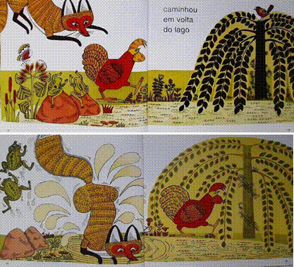 Nessa ilustração, temos dois sapos que se assustam com o pulo da raposa para cima de Rosinha, que continua não vendo nada do que acontece ao seu redor.