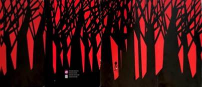 O caminhar do menino por entre as grandes árvores vem acompanhado da ideia de busca, pois esta é a grande aventura vivida pelo personagem na narrativa, a busca por uma resposta que o leve a compreender o que é e como é a boca da noite. Uma busca projetada na visualidade de uma caminhada contínua que atravessa as extremidades do projeto gráfico do livro.