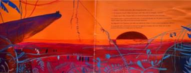 Emoldurada com traços e cores que evocam o onírico, o diálogo entre texto e imagem se revela por meio da função de amplificação que ocorre quando um enunciado “diz mais que o outro sem contradizê-lo ou repeti-lo [...] trazendo um discurso suplementar ou sugerindo uma interpretação” (Linden, 2028, p. 125). Sob esse formato, a experiência de leitura transmitida pela imagem torna compreensível a possibilidade de ampliação ou superação do visual sobre o verbal, conforme defende Lima: “A ilustração é uma forma de arte visual que, por sua criatividade, colorido, projeção, estilo ou forma, amplia, diversifica e pode até, por vezes, superar a própria leitura do texto narrado” (Lima, 2008, p. 41). Essa possível superação revela-se nos sentimentos despertados pela percepção da cor e dos demais elementos visuais que compõem a atmosfera que serve de moldura para todo o cenário.