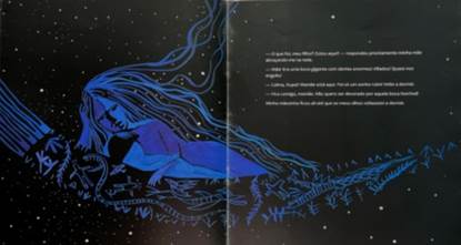 Resultante do afinamento poético entre texto e imagem, a experiência de apreensão segue por uma via que supera a leitura do verbal dissociada do visual. Na passagem, após narrar os momentos de aflição e medo vividos durante o pesadelo com a boca da noite, Kupai recorre à proteção da mãe: “– Calma Kupai! Mamãe está aqui. Foi só um sonho ruim! Volte a dormir” (Wapichana, 2016, n.p). O gesto de proteção da mãe é revestido de uma atmosfera sobrenatural na composição do cenário, na projeção das cores e nas configurações visuais empregadas nos traços que dão forma à imagem. Ao encontro dessa configuração, Graça Lima pontua: “A imagem cria a atmosfera do texto e desse modo o potencial imaginário do leitor passa por variações plasticamente distintas” (Lima, 2008, p. 41). Na representação imagética da passagem, constituída por imagens ricas de significado, todos os elementos convergem para a criação da atmosfera onírica narrada. Para a expressão do sonhado, a luminosidade do azul celeste que reveste os personagens contrasta com a cor da noite ornamentada com o céu estrelado que embala mãe e filho.