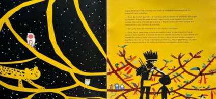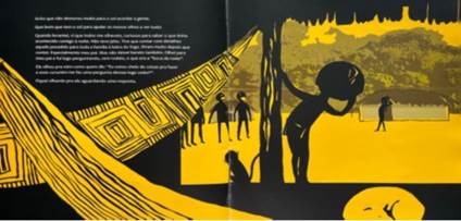 Em A boca da noite, após a noite de pesadelo do Kupai, a sequência narrativa é marcada pela presença do intenso amarelo como referência à luz de um novo dia a ser enfrentado pelo personagem. Dessa forma, a interação entre palavra e imagem resulta em uma apreensão mais significativa da obra em suas diferentes nuances de cores e imagens, conforme revela a passagem: