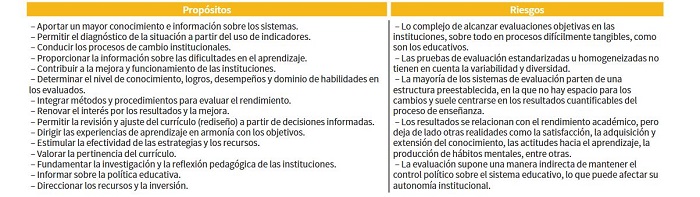Autores como Egido (2005, p. 22-25), UNESCO (2000, p. 20) y Rosales (2014, p. 6), describen que el proceso de evaluación y sus prácticas se fundamentan en los propósitos que se pueden intencionar al interior de las instituciones y los agentes externos, sin embargo, algunos de ellos reconocen que estas prácticas también conllevan riesgos asociados para el sistema educativo. Algunos de estos propósitos se describen a continuación: Tabla 1