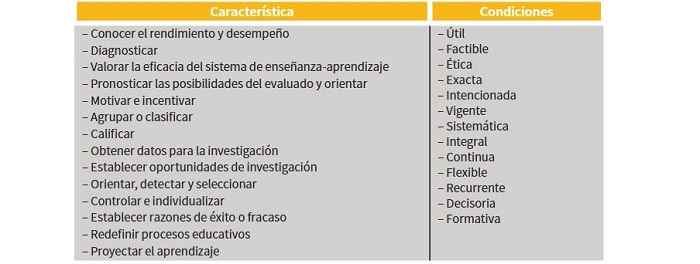 La evaluación debe estar determinada por una serie de cualidades o condiciones que delimitan su función en virtud de los procesos educativos que requieren las instituciones. Para ello, Stufflebeam y Shinkfield (1995, p. 27, 114), Álvarez (2010, p. 163) y Rosales (2014, p. 4), proponen las siguientes características y condiciones: Tabla 2.