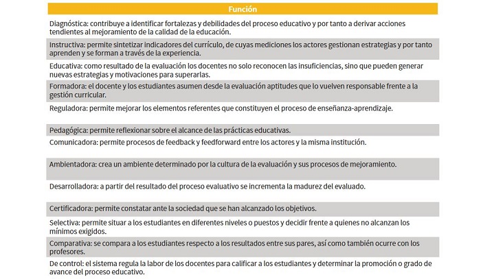 Para que una institución determine los tipos de evaluación que requiere, es necesario que primero estime el alcance de aquellas funciones que cumplen las herramientas de recolección cuando se requiere evaluar los procesos, por tanto, Mora (2004), p. 4; Matos y Matos (2011), p. 20-21; Rosales (2014), p. 7; y Hamodi et al. (2015), p. 150, describen aquellas funcionalidades que cumple la evaluación educativa: Tabla 3.