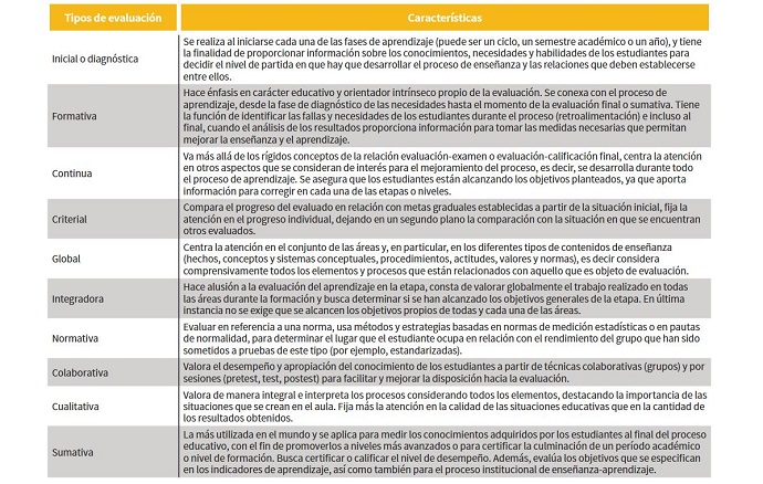 De acuerdo con el alcance que se propone en la formación de los estudiantes, es decir, entre sus diferentes niveles, toda institución puede establecer el tipo de evaluación que requiere en términos del enfoque y objetos (muestra de comportamientos). Así las cosas, Stufflebeam y Shinkfield (1995), p. 345; Collazos et al. (2007), p. 73-74; Álvarez (2010), p. 162; Rosales (2014), p. 9; Ayala (2015), p. 4; Rangel (2019); y Perazzi y Celman (2017), p. 24, proponen: Tabla 5.