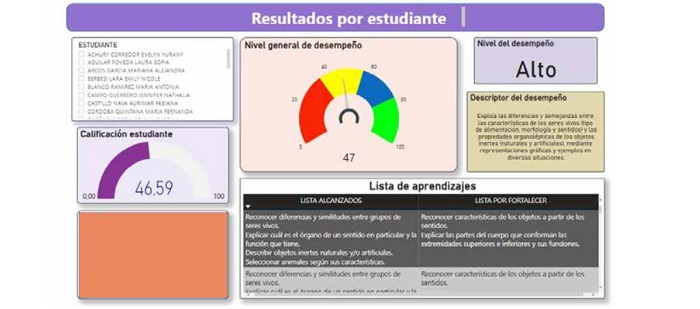 en relación con la gestión de los instrumentos de la evaluación, es necesario garantizar no solo la administración de las notas (software), sino el desarrollo de tableros que gestionen atributos mixtos (cualitativos y cuantitativos) como resultado de la aplicación de los instrumentos, los cuales se pueden derivar de los parámetros definidos en el punto anterior. Por ende, es necesario establecer los puntos de corte para los niveles de desempeño o domino (revisar standard setting), si la evaluación es por competencias. Se recomienda la implementación de estos tableros haciendo uso de herramientas como Power BI de Microsoft o Tableau (figura 1)
