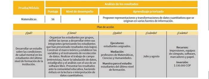 para lograr el éxito de las estrategias definidas en el plan, es importante definir acciones que vayan más allá de aplicar pruebas y resolver preguntas, aquí es necesario que se diseñen experiencias de aprendizajes que involucren varios momentos (y por tanto habilidades progresivas), es decir, por ejemplo una secuencia didáctica, en donde el estudiante se confronte con: la evocación, comprensión, aplicación, análisis y evaluación de saberes, habilidades y conocimientos propios de estos aprendizajes priorizados. A manera de ilustración y dependiendo del componente disciplinar, se pueden establecer: experiencias de laboratorio, trabajos de campo, estudios, salidas pedagógicas, investigaciones, proyectos, jornadas, simulaciones, entre otros. Estos planes de acción, no se pueden pensar para una clase o espacio académico en particular, se debe contemplar un tiempo más pertinente y se deben proponer recursos más allá del “papel y lápiz” (por ejemplo: el uso de aplicaciones, software, dispositivos, bases de datos, entre otros). Luego de su implementación, lo que finalmente queda por hacer es el seguimiento a la ejecución de estas acciones propuestas (eficacia), lo cual se puede estimar mediante un indicador de porcentaje de actividades cumplidas, pero el seguimiento más importante es verificar la eficiencia del plan a través de los resultados que reporten nuevamente las pruebas tanto internas como externas. Si los resultados son favorables, es decir, se evidencian mejoras, se recomienda incorporar la experiencia al currículo, de lo contrario sería necesario hacer ajustes al plan o las estrategias y finalmente, se da continuidad al ciclo de gestión de la evaluación, retomando de nuevo el punto de partida. figura 3