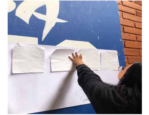 C) Resultados del Retazo de experienciaPor medio de la técnica Retazo de experiencia se indagó con los usuarios sobre las estrategias pedagógicas que más han contribuido al fortalecimiento de sus habilidades sociales. Su desarrollo se llevó a cabo en las instalaciones físicas del INDER de Medellín, en donde se desarrollan las actividades del grupo; se trató de propiciar un espacio tranquilo, ameno y seguro de conversación con los usuarios, se les entregó el material y se les explicó de manera verbal el objetivo de la técnica y la manera en que se ejecutaría, pues se les hacían las preguntas para responder. Al finalizar el ejercicio se procedió con la transcripción de la información. Ilustración 3