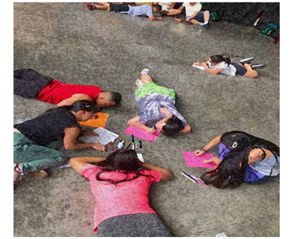 Colcha de cuidado: Se indagó a los cuidadores de algunos usuarios del programa Lions Dance del INDER de Medellín, sobre los avances que vislumbraban en relación al desarrollo de habilidades sociales de los usuarios, a causa de su participación en el programa. Se reunió los cuidadores en un grupo en el que socializaron sus perspectivas sobre los avances de los usuarios y plasmaron su visión en un collage y en hojas individuales y posteriormente en una creación colectiva.