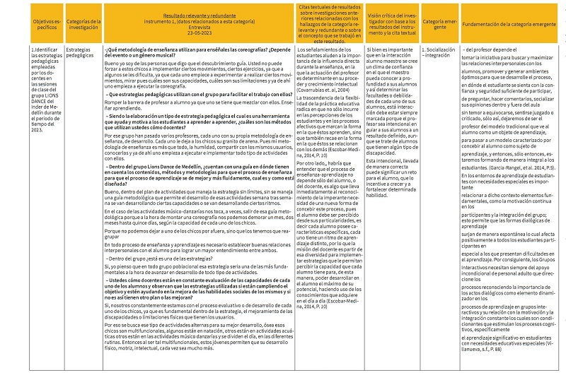 A) Resultado de la entrevista:La entrevista tuvo como objetivo identificar las estrategias pedagógicas empleadas por los docentes en las sesiones de clase del grupo Lions Dance del Inder de Medellín durante el periodo de tiempo del 2023. Por esto, las preguntas realizadas en la entrevista al profesor del grupo Lions Dance del Inder de Medellín, estuvieron orientadas a la categoría de estrategias pedagógicas, puesto que su intención era acercarse a las que este utiliza, de forma específica con el grupo.