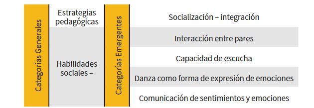 A partir de las respuestas obtenidas de los usuarios, los cuidadores y del docente, los conceptos dados por los autores y el análisis de los datos conjuntos, se obtuvieron cinco tendencias emergentes, una de la categoría Estrategias pedagógicas: Socialización – integración y cuatro de la categoría de habilidades sociales: Interacción entre pares, Capacidad de escucha, Danza cómo forma de expresión de emociones, Comunicar sentimientos y emociones, como se plantea a continuación.