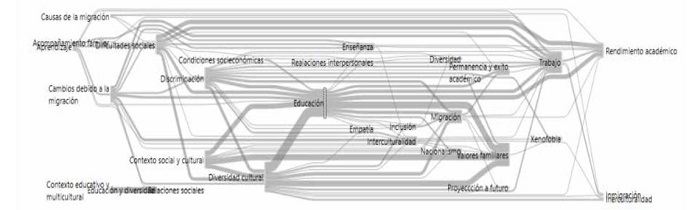 De la misma manera, se evidencian también relaciones menos mediadas por la educación como; las que se dan entre las causas de la migración, el trabajo de los padres de familia migrantes, su acompañamiento y el rendimiento académico. Otro aspecto a tener en cuenta de manera preliminar, es la relación de cercanía que se da entre el código de discriminación, las condiciones socioeconómicas de los migrantes y el reconocimiento de la diversidad cultural. Por último, en este análisis preliminar, es posible mencionar las relaciones de proximidad entre los códigos: migración, empatía, inclusión e interculturalidad que se desarrollan con detalle más adelante.