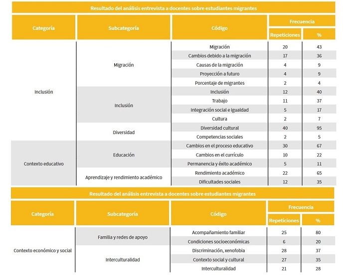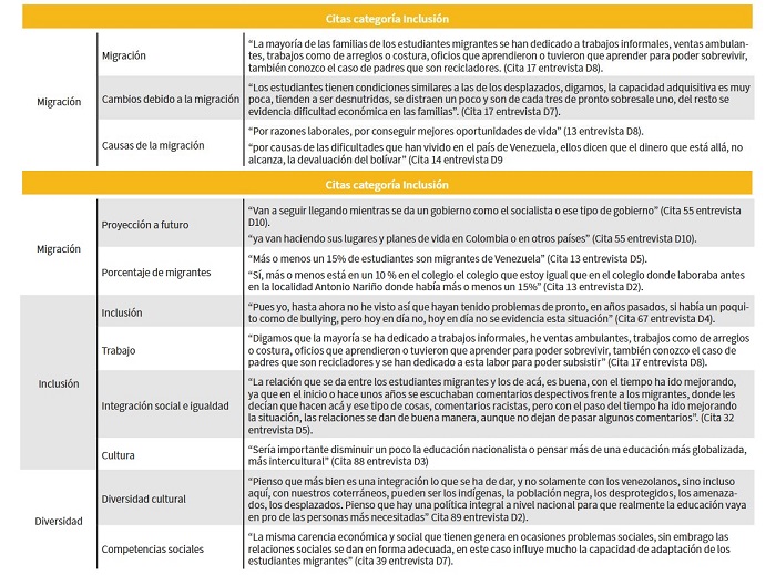 A continuación, se desarrollan con detalle los hallazgos de las categorías: En la categoría de inclusión de estudiantes migrantes en el sistema educativo público, como hallazgo principal en esta categoría se encuentra que los docentes reconocen a los migrantes como una población representativa y que está en aumento, situación que conduce a pensar en estrategias a largo plazo o en medidas que perduren en el tiempo reconociendo que la problemática no se solucionará o cambiará en corto plazo. También, que los docentes reconocen las posibilidades de la migración en el progreso de las sociedades, de tal manera que según las entrevistas los docentes tienen una posición positiva de los migrantes en la escuela.