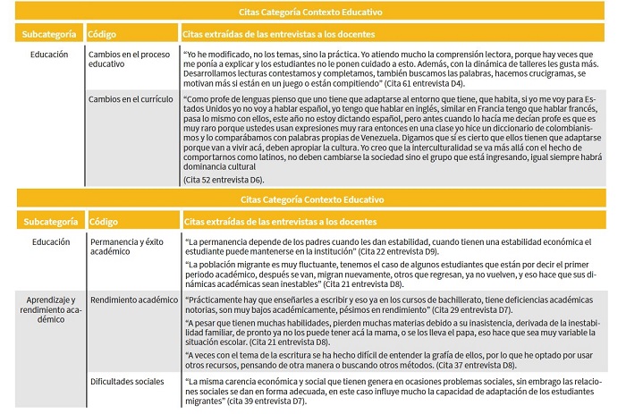 A continuación, Se desarrolla el resumen del análisis de los resultados de la categoría denominada contexto educativo, en este se encuentra la subcategoría Educación que contiene tres códigos de análisis a saber: 1) Cambios en el proceso educativo (67%), en este código se evidencia que desde la percepción de los docentes, no se han evidenciado cambios notorios en el proceso educativo como tal, eso quiere decir que no se han modificado las políticas o lineamientos teniendo en cuenta la inclusión de los migrantes, en este caso lo que se menciona es que los docentes utilizan diferentes herramientas y hacen cambios en sus prácticas pedagógicas para favorecer el bienestar de los estudiantes migrantes. 2) Cambios en el currículo (22%), en este código se reafirma que no se han dado cambios en las políticas o lineamientos, pero, según la percepción de los docentes, tampoco se han presentado cambios a nivel institucional en lo que tiene que ver con el currículo, esta percepción acentúa la poca o nula importancia que se le da a la inclusión de los migrantes en el sistema educativo. 3) Permanencia y éxito académico (11%) en este código, según la percepción de los docentes se vincula el éxito y la permanencia académica al acompañamiento y estabilidad que ofrecen las familias a los jóvenes migrantes, también al nivel económico y de estabilidad de las redes de apoyo que son los grupos o entornos familiares
