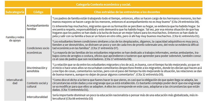 En la categoría del contexto familiar y social; se evidencia que, en resumen, la condición socioeconómica de los migrantes es precaria, están ubicados en trabajos informales que exigen mucho tiempo, esto sumado a las redes de apoyo débiles debido a la ubicación de las familias en Venezuela, generan que los estudiantes tengan poco apoyo o acompañamiento familiar, en palabras de Guio y Torres (2023) los lugares receptores “son escenarios hostiles para las familias migrantes y, en su gran mayoría, son lugares que abusan de la condición vulnerable de los migrantes” (p. 69). Por otra parte, los docentes afirman que el rendimiento de los estudiantes migrantes es bajo y su permanencia depende de la estabilidad laboral y económica de los padres, además que interfiere aspectos socioemocionales como el desarraigo que Lozano (2022) lo define como “un proceso de rupturas complejas producidas en el ser y el hacer de personas, grupos y comunidades dentro de estrategias de subyugación y sometimiento” (P. 11).