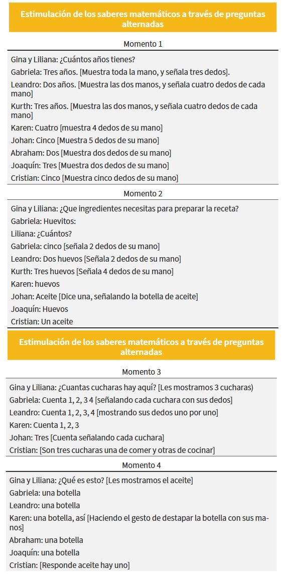 Madre 1: [...] él ahora está metido mucho en el número 2 y él dice que tiene 5 años pero con sus dedos señala 2 todo el tiempo y siempre cuando estamos haciendo cosas tratamos como de contar las cosas que estamos haciendo, si estamos guardando los juguetes pues contamos un poco, si estamos en la cocina contamos un poco de la cocina cuantos alpinito le quedaron, por ejemplo, el dice tengo dos alpinito entonces le preguntamos si te comes uno ¿cuántos te quedan? Pero ese es un proceso que poco a poco lo estamos tratando a través de las rutinas de casa, pero no es algo que él lo haga solo (Transcripción: 30 de octubre de 2018).