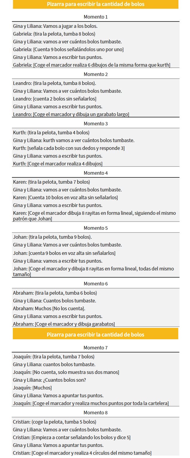 Este conocimiento previo consistió en invitar a los niños y niñas a escribir en una pizarra la cantidad de bolos que derribaban. Inicialmente, se les explico en qué consistía la tarea de derribar los bolos con la pelota. Seguidamente, cada niño y niña experimento con la pelota el derribar los bolos con la finalidad de que ellos en la pizarra pudiesen anotar los bolos derribados. Es importante resaltar que la tarea matemática enfocada en los bolos fue implementada en cada uno de los hogares de los participantes, por lo que a continuación, se presentan diferentes momentos en torno a este conocimiento previo: Cuadro 6.