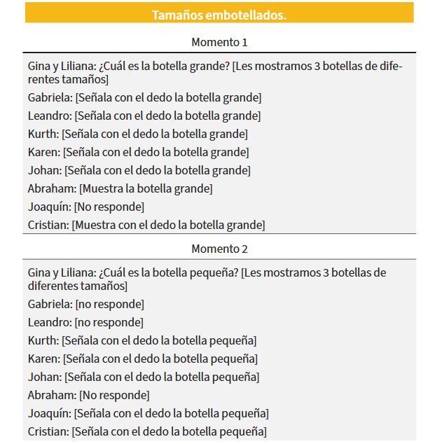 Este conocimiento previo de matemática consistió en mostrarle a los niños tres botellas de diferentes tamaños y preguntarles cual es la botella más grande y cuál es la más pequeña, ellos señalaron con sus dedos la botella del tamaño que consideraban correspondiente. A continuación, se presentan diferentes momentos en torno a este conocimiento previo: Cuadro 7.