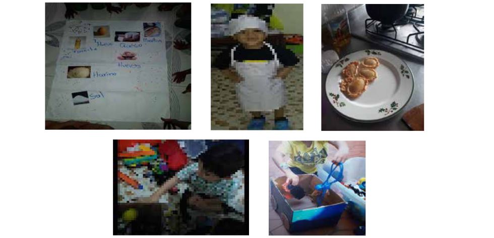 Adicionalmente, se presentan algunas fotos donde se evidencia la los niños y niñas participantes de este estudio exploraron de manera positiva y motivados cada de las tareas propuestas, apropiándose de las mismas mediante diferentes elementos como, por ejemplo: el traje para cocinar, la caja de juguetes, etc. Figura 1.