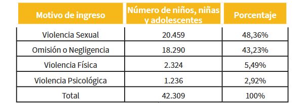 Dentro del proceso investigativo se identifica como uno de los principales motivos: la negligencia, con uno de los porcentajes más altos: el 19,9%; seguidamente el presunto abuso sexual y falta de red de apoyo familiar con un 8,6%; la violencia intrafamiliar, el abandono y problemas conductuales con un 6,9%; dificultades en el reconocimiento de normas y limites 5,2%