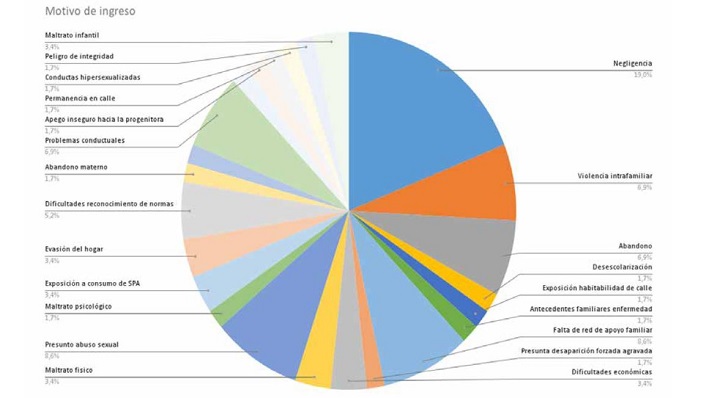 Entre otros motivos de ingreso, se menciona el peligro de integridad, conductas hipersexualizadas (este tipo de conductas se generan cuando el niño o la niña han sido víctimas de algún abuso sexual o han estado expuestos), permanencia en calle, apego inseguro hacia la progenitora, desescolarización, fallecimiento de la progenitora, abandono materno, maltrato psicológico, presunta desaparición agravada en medio familiar.