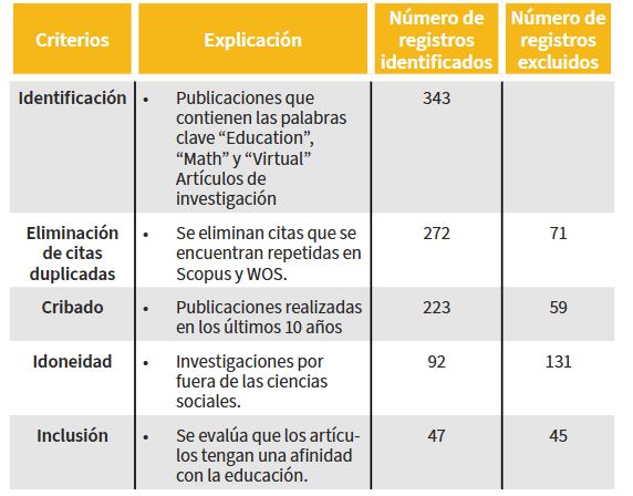 De acuerdo con lo expuesto hasta aquí y con una intención posterior de establecer estrategias de enseñanza de las matemáticas, mediadas por procesos de virtualidad en instituciones de educación básica, media y universitaria en los sectores público y privado, se realiza una fase inicial que consta en una revisión bibliográfica sistemática y estructurada, que parte de procesos bibliométricos y usa la metodología Prisma, en estudios realizados en procesos de educación matemática mediados por la virtualidad.
